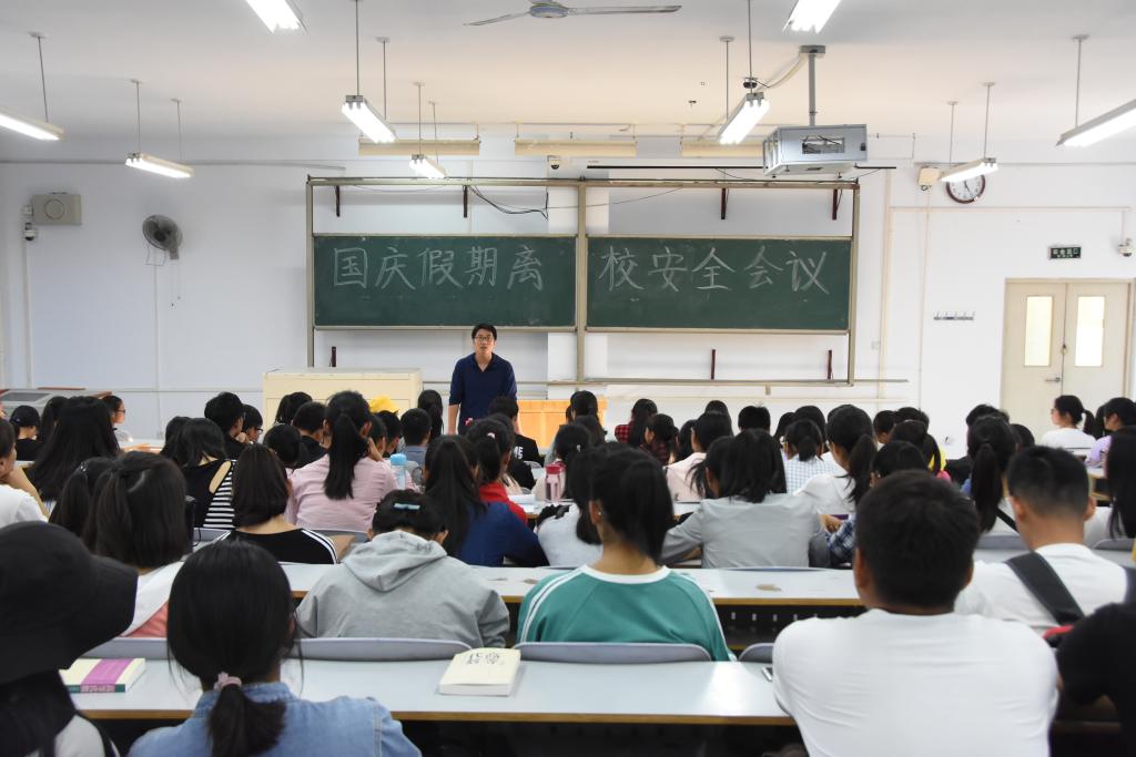 在九合二召开国庆假期离校安全会议。2018级全体学生参加会议。
