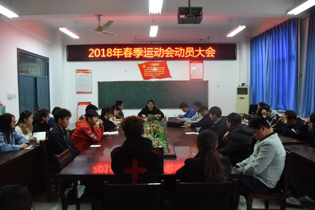 为迎接即将到来的校运动会,我院于3月16日下午在三楼会议室召开校春季运动会动员大会,辅导员刘喜明老师、学生会体育部成员、各班班长及文体委员参加了此次会议。