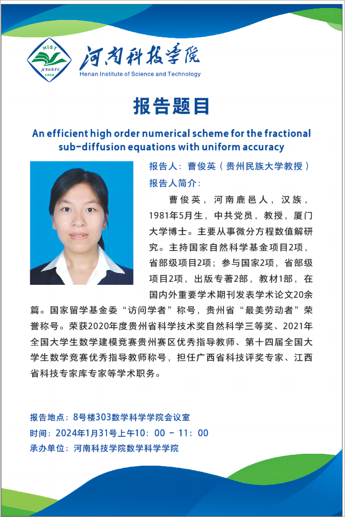 报告人简介:曹俊英,河南鹿邑人,汉族,1981年5月生,中共党员,教授,厦门大学博士。主要从事微分方程数值解研究。主持国家自然科学基金项目2项,省部级项目2项;参与国家2项,省部级项目2项,出版专著2部,教材1部,在国内外重要学术期刊发表学术论文20余篇。国家留学基金委“访问学者”称号,贵州省“最美劳动者”荣誉称号。荣获2020年度贵州省科学技术奖自然科学三等奖、2021年全国大学生数学建模竞赛贵州赛区优秀指导教师、第十四届全国大学生数学竞赛优秀指导教师称号,担任广西省科技评奖专家、江西省科技专家库专家等学术职务。