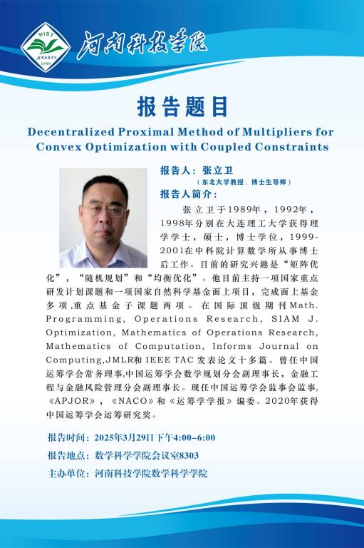 报告人简介:张立卫于1989年,1992年,1998年分别在大连理工大学获得理学学士,硕士,博士学位,1999-2001在中科院计算数学所从事博士后工作。目前的研究兴趣是“矩阵优化”,“随机规划”和“均衡优化”。他目前主持一项国家重点研发计划课题和一项国家自然科学基金面上项目,完成面上基金多项,重点基金子课题两项。在国际顶级期刊Math. Programming, Operations Research, SIAM J. Optimization, Mathematics of Operations Research, Mathematics of Computation, Informs Journal on Computing,JMLR和IEEE TAC发表论文十多篇。曾任中国运筹学会常务理事,中国运筹学会数学规划分会副理事长,金融工程与金融风险管理分会副理事长。现任中国运筹学会监事会监事,《APJOR》,《NACO》和《运筹学学报》编委。2020年获得中国运筹学会运筹研究奖。