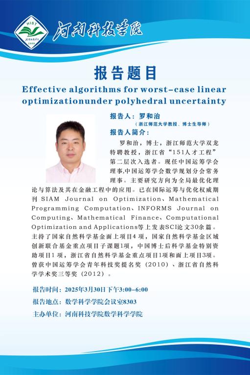 报告人简介:罗和治,博士,浙江师范大学双龙特聘教授,浙江省“151人才工程”第二层次入选者。现任中国运筹学会理事,中国运筹学会数学规划分会常务理事。主要研究方向为全局最优化理论与算法及其在金融工程中的应用。已在国际运筹与优化权威期刊SIAM Journal on Optimization、Mathematical Programming Computation、INFORMS Journal on Computing、Mathematical Finance、Computational Optimization and Applications等上发表SCI论文30余篇。主持了国家自然科学基金面上项目4 项,国家自然科学基金区域创新联合基金重点项目子课题1项,中国博士后科学基金特别资助项目1 项,浙江省自然科学基金重点项目1项和面上项目3项。曾获中国运筹学会青年科技奖提名奖(2010)、浙江省自然科学学术奖三等奖(2012)。