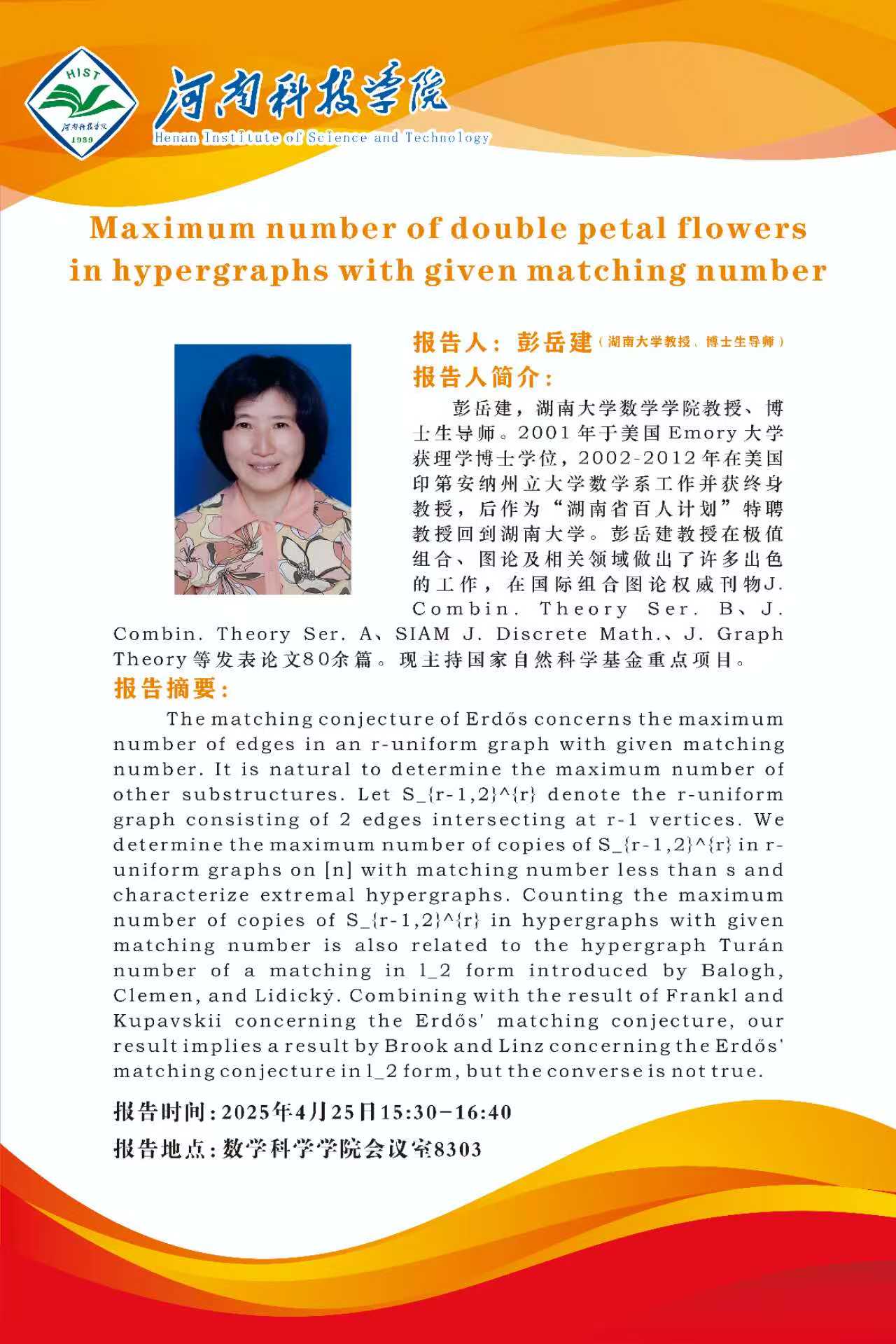彭岳建,湖南大学数学学院教授、博士生导师。2001年于美国Emory大学获理学博士学位,2002-2012年在美国印第安纳州立大学数学系工作并获终身教授。彭岳建教授在极值组合、图论及相关领域做出了许多出色的工作,在国际组合图论权威刊物J. Combin. Theory Ser. B、J. Combin. Theory Ser. A、SIAM J. Discrete Math.、J. Graph Theory等发表论文80余篇。现主持国家自然科学基金重点项目。