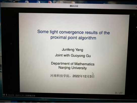 2022年12月3日上午,南京大学博士生导师、国家优秀青年基金获得者杨俊锋教授受邀为我院师生做了一场关于《Some tight convergence results of the proximal point algorithm》的学术报告,报告会由嗨皮漫画