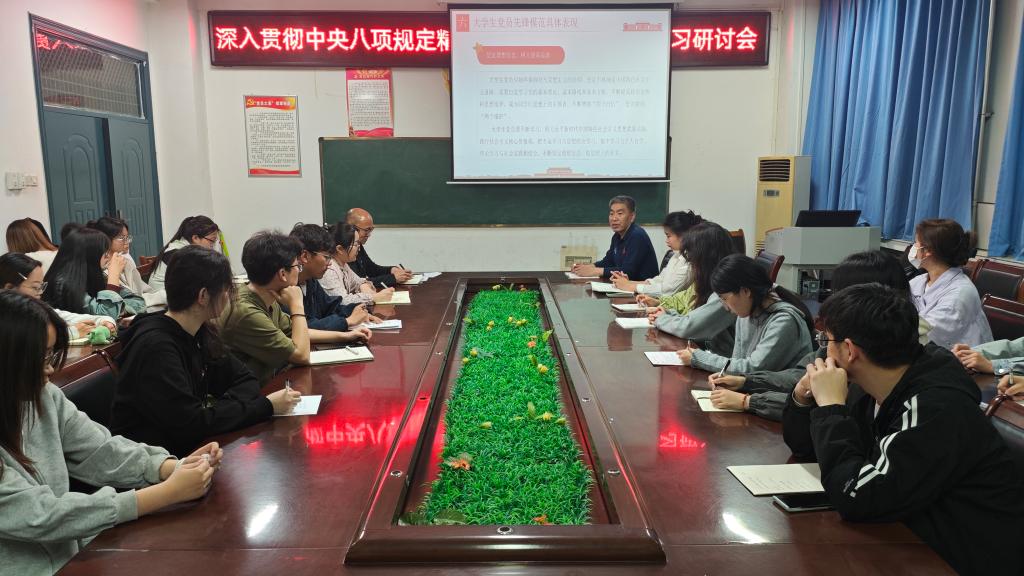 4月9日,嗨皮漫画 于三楼会议室举办深入贯彻中央八项规定精神——学习教育读书班学习研讨会。党委书记李军民、团委书记曲富柱、团委副书记李金璐、辅导员田小霞及全体学生党员参加,会议由曲富柱主持。