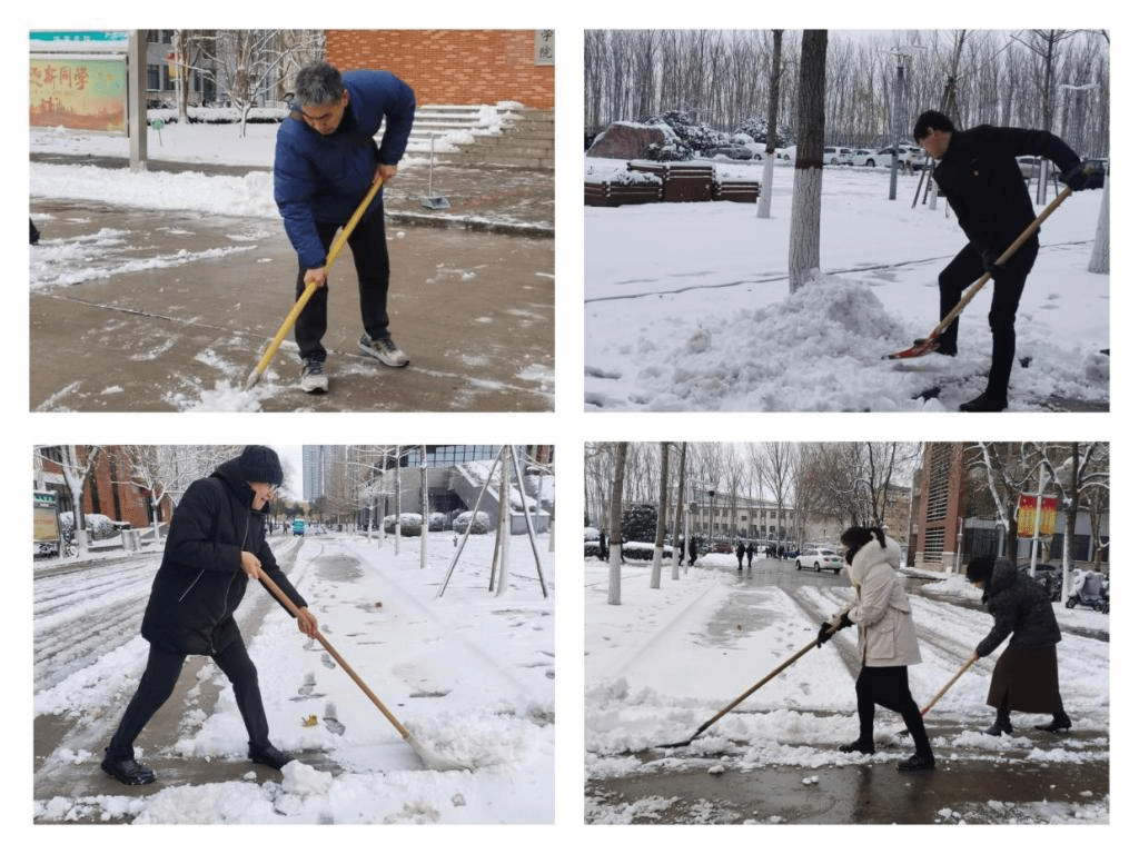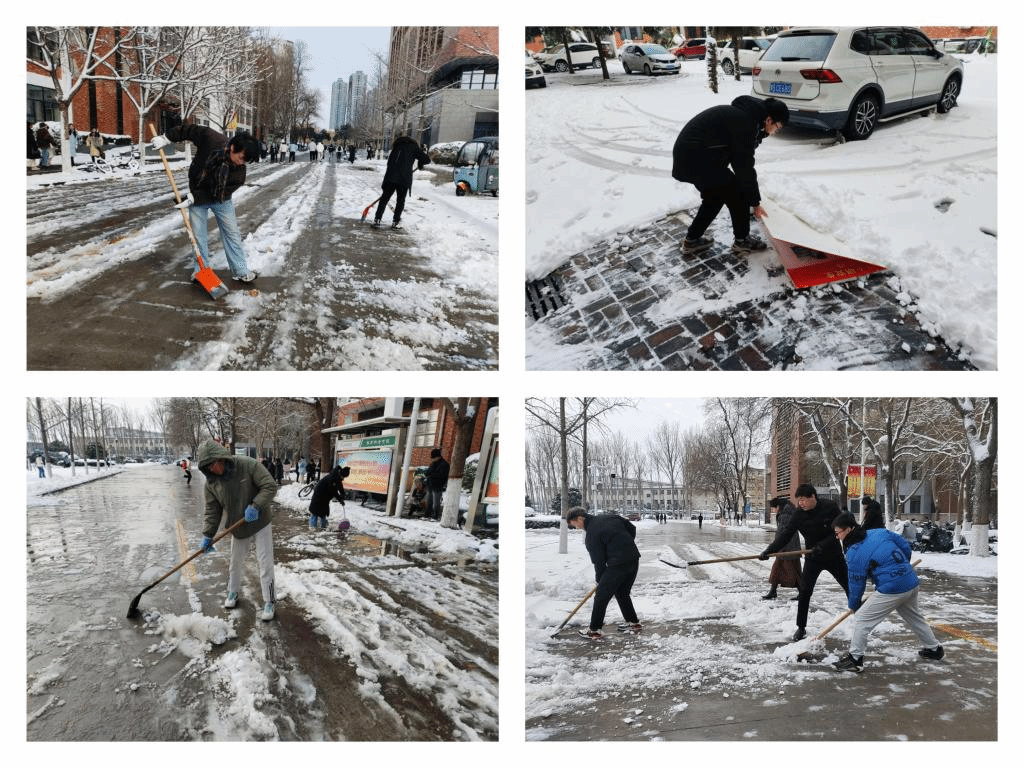 活动中,学院党委书记李军民、党委副书记马宝林和团委书记曲富柱以身作则,带领全体党员在八号楼门前清扫积雪、铲除冰块,以实际行动践行“奉献、友爱、互助、进步”的志愿服务精神。