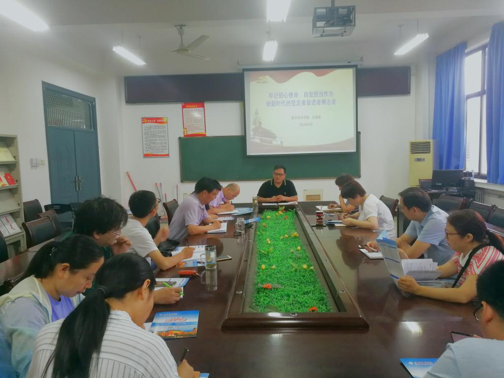 会上,任建成做了题为《牢记初心使命,自觉担当作为,做时代的坚定者、奋进者和搏击者》的主题报告。报告引领大家深入学习了党的十九大的主题、习近平新时代中国特色社会主义思想的历史地位和丰富内涵及党的十八大以来党和国家事业发生的历史变革等内容。并根据学校和学院的工作实际结合“不忘初心、牢记使命”主题教育,向全体同志提出要求:一、坚持永不懈怠的精神状态,做执着的坚定者;二、保持一往无前的奋斗姿态,做实干的奋进者;三、秉持只争朝夕的拼搏心态,做勇敢的搏击者。报告最后指出,历史车轮滚滚向前,时代潮流浩浩荡荡。作为一个共产党员,唯有顺应新潮流,贯彻新思想,落实新要求,做新时代的坚定者、奋进者、搏击者,才能在百舸争流中劈波斩浪、在千帆竞济中勇立潮头。