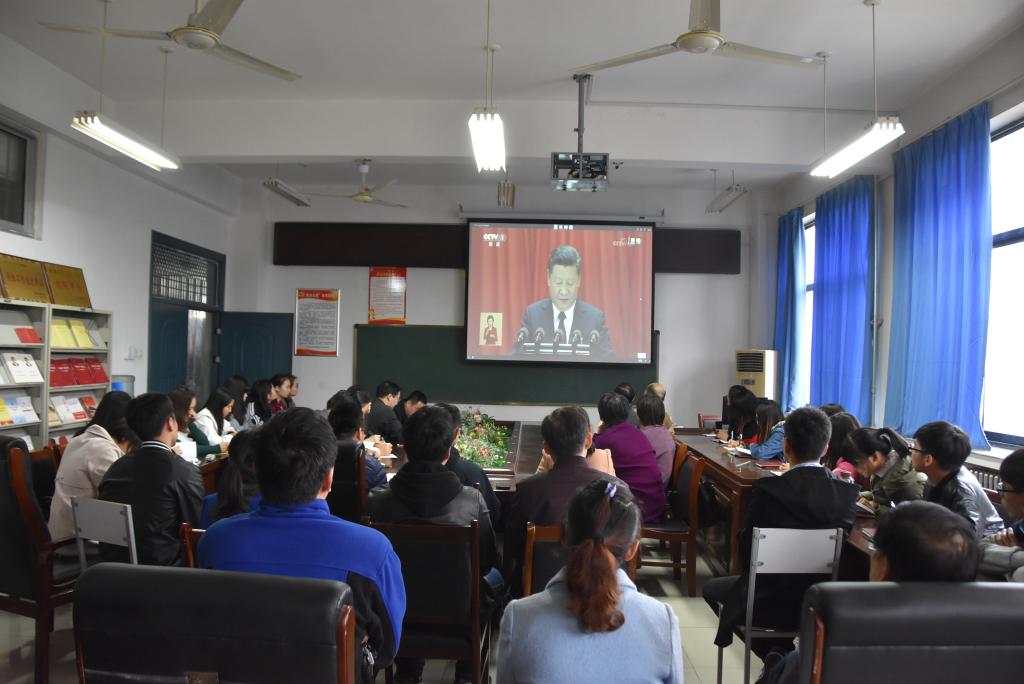 在我院103、302会议室,我院80余名师生共同认真听取了以习近平同志为核心的党中央的工作报告。大家一致认为,党的十九大是一次肩负重大使命的历史盛会。在全面建成小康社会决胜阶段、中国特色社会主义发展关键时期召开的党的十九大,将向全世界明确宣示——在中国共产党的领导下,十三亿多中国人民将继续高举中国特色社会主义伟大旗帜,坚定不移沿着中国特色社会主义道路前进。“中国号”巨轮也将沿着正确的航向劈波斩浪,驶向民族复兴的光辉彼岸!