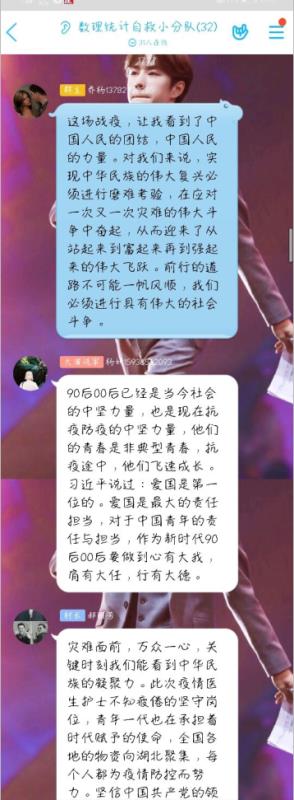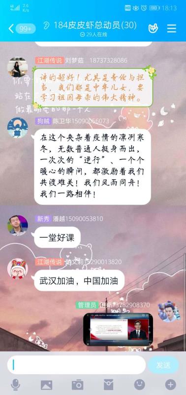 将近两个小时的课程很快结束了,但是同学们依然意犹未尽,并自发在班级群中畅聊感悟,讨论收获。大家纷纷表示,大难无情人有情,作为当代大学生,我们更应该肩负起年轻人的责任,保持积极乐观的心态,要用实际行动彰显赤子之心,用满腔热血书写青春色彩,同心协力打赢这场防疫阻击战,为祖国伟大复兴事业贡献力量!