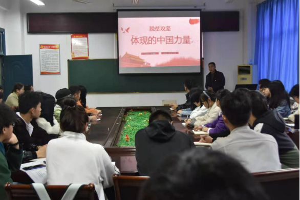 李军民带领同学们全面回顾了党和国家带领全国各族人民脱贫攻坚的光辉历程。课堂上,他还结合自己省派驻村第一书记的工作经历,通过图文并茂的方式与同学们分享了驻村脱贫工作的“酸甜苦辣”,用生动鲜活事例展示了脱贫攻坚给人民群众生活带来翻天覆地的变化。