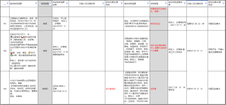 经过11天的紧张工作,共对接工作1000余条,加急工作60余条,志愿工作时间300多个小时,对接的主要地点包括郑州、新乡、安阳、鹤壁、周口、焦作等地,联系对接食品、饮用水、救援艇、水泵、口罩、各类药品等重要救援物资,惠及受灾群众约四万人。