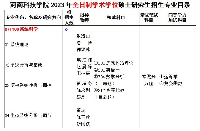 系统科学:属一级学科,招收学硕。2017年申请获批,2019年开始招生。下设四个研究方向:复杂系统分析与控制、系统优化理论与算法、非线性动力系统、统计建模与分析。