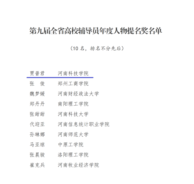 根据《中共河南省委教育工委办公室河南省教育厅办公室关于组织开展“第九届全省高校辅导员年度人物” 暨“2022 年最美高校辅导员”推选活动的通知》(豫教工委办〔2022〕45 号)要求,经学校推荐、材料评审、综合评议等环节,我院贾普君老师荣获“第九届全省高校辅导员年度人物”提名奖。