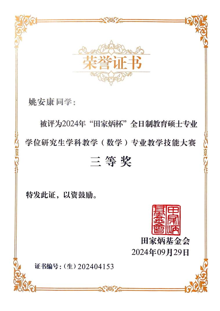 9月29日,全国“田家炳杯”全日制教育硕士专业学位研究生学科教学(数学)专业教学技能大赛总决赛落下帷幕,我院2022级研究生姚安康在刘娟老师的指导下荣获三等奖。