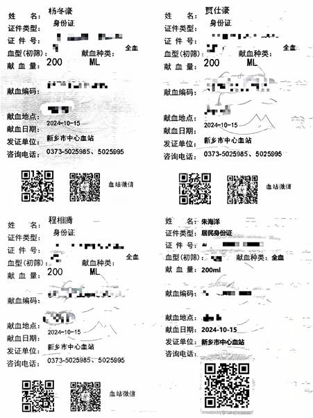 统计222班的杨冬豪、数学242班的程相腾、以及来自计算241班的朱海洋和贾仕豪四位同学,在得知消息后,毫不犹豫地赶往献血地点。以实际行动,生动诠释了无私奉献的高尚情操,彰显了新时代青年的责任感与使命感。献血结束后,这四位同学默默返回校园,随即投身于紧张的学习之中,展现了青年学子的责任与担当。