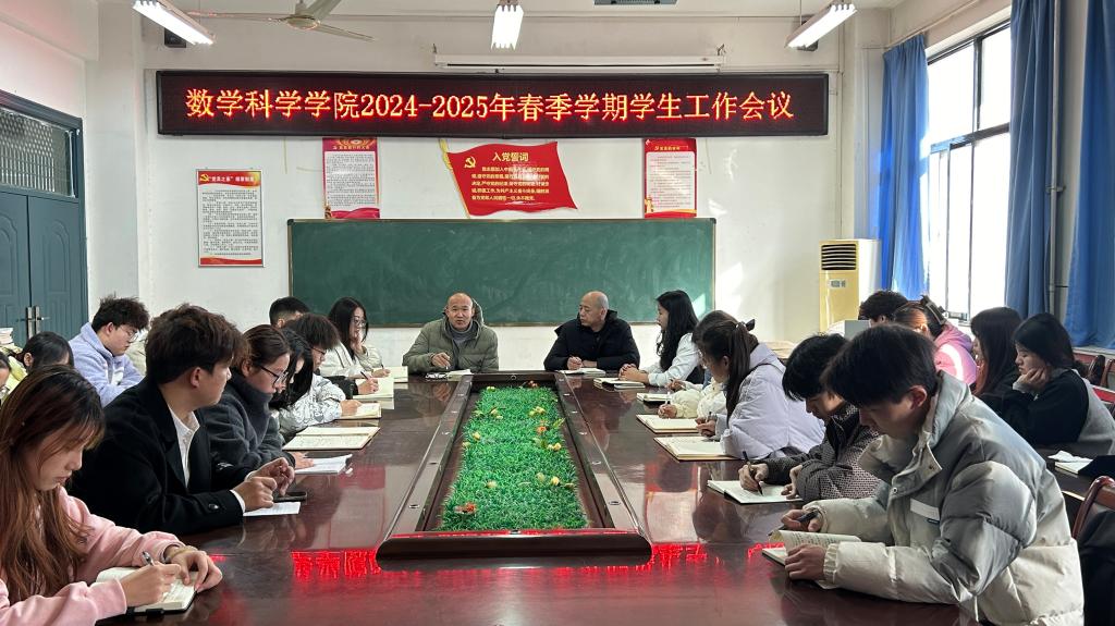 会议伊始,李金璐对我院在2024~2025学年第一学期学生工作取得的成绩表示肯定,并对新学期工作提出了期望。随后,曲富柱就新学期报到事宜、安全教育、学风建设及日常管理等进行部署,并对后续工作的开展做出了指导。最后,马宝林对学生干部提出了三项建议:一是以数学思维锤炼担当品质,做信仰坚定的引领者;二是以数学精神赋能实践创新,做知行合一的实干者;三是以数学之美凝聚团队力量,做向阳而生的同行者。