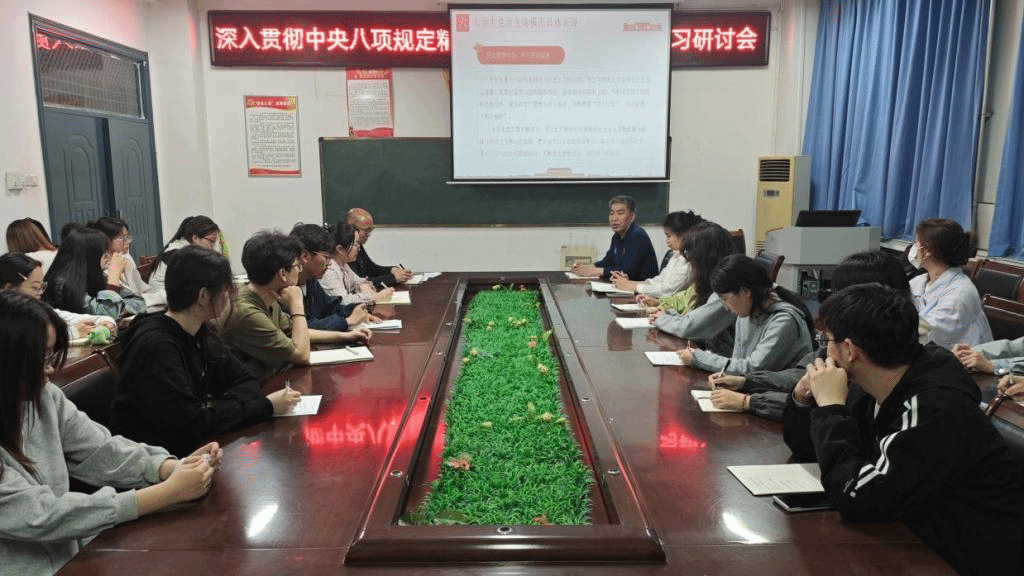 4月9日,嗨皮漫画 于三楼会议室举办深入贯彻中央八项规定精神学习教育研讨——读书班学习研讨会。党委书记李军民、团委书记曲富柱、团委副书记李金璐、辅导员田小霞及全体学生党员参加。会议由曲富柱主持。