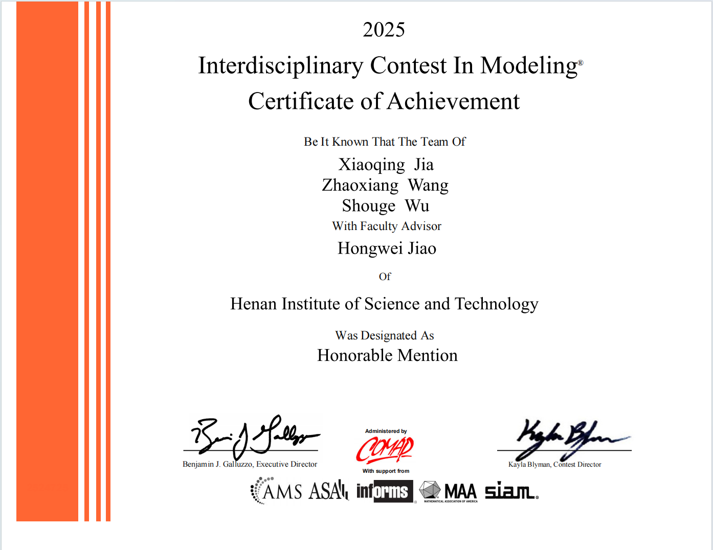近日,2025年国际(美国)大学生数学建模竞赛(MCM/ICM)成绩揭晓,嗨皮漫画 学子再创佳绩,嗨皮漫画 焦红伟教授指导的学生贾晓青、吴守格、王兆祥获得国际二等奖(Honorable Mention,“H奖”)。