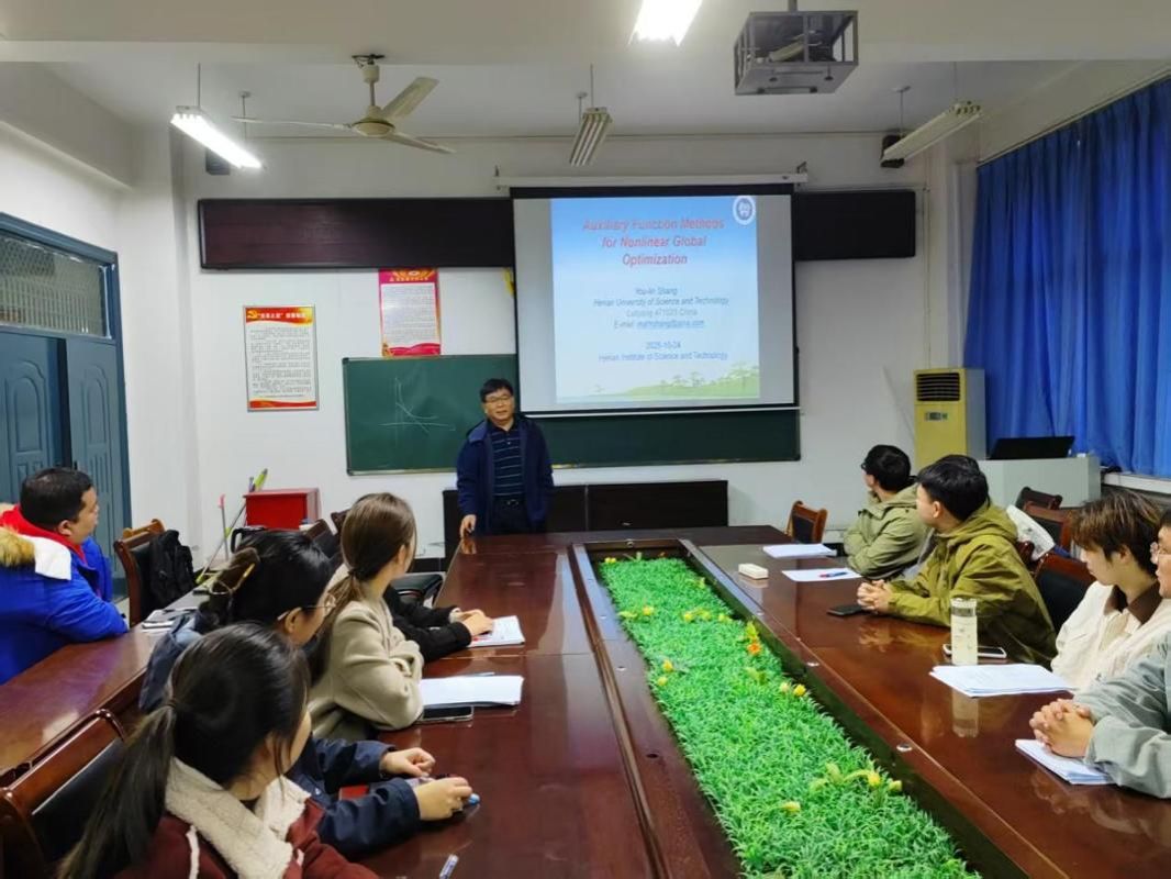 尚有林教授作了题为“非线性全局优化的辅助函数方法”的学术报告。他从多峰函数全局优化这一难点问题切入,系统介绍了填充函数法的基本原理与发展历程。他提出了一种新型无参数连续可微填充函数,解决了传统方法中梯度类算法难以直接应用、参数调节复杂等问题。并结合非线性方程求解、数据拟合等实例,展示了该方法在实际问题中的应用潜力,并鼓励研究生在算法设计中注重理论与应用的结合。