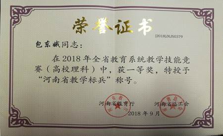 日前,校工会传来喜讯,我院教师包东娥在2018年全省教育系统教学技能竞赛中取得高校理科组一等奖的好成绩,并被授予“河南省教学标兵”的称号。
